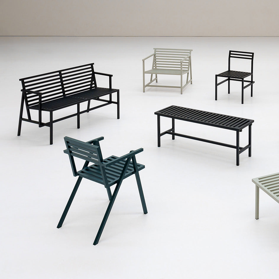 Each piece in the collection has a unique design, but they are unified by the material, colour and the proportions of the aluminium extrusion that defines the collection. You have the option to be playful and select chairs and benches of different designs to place around a table, or choose a matching set.