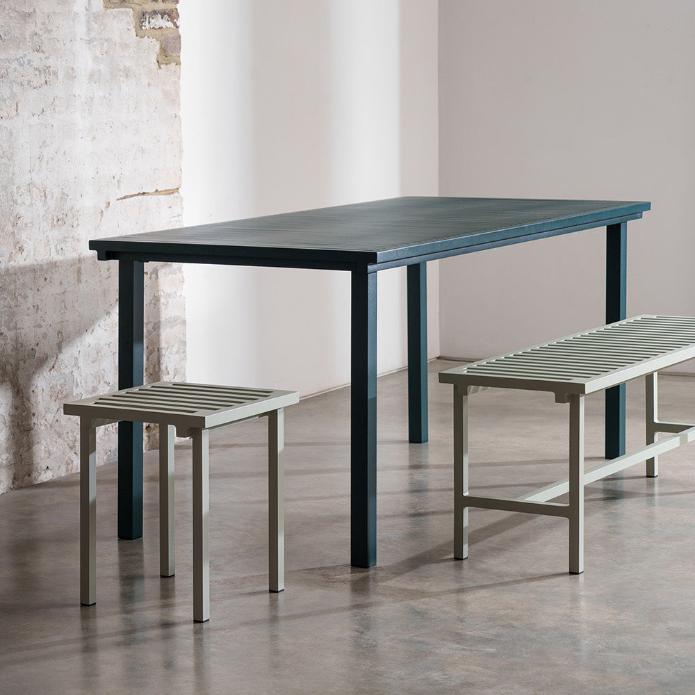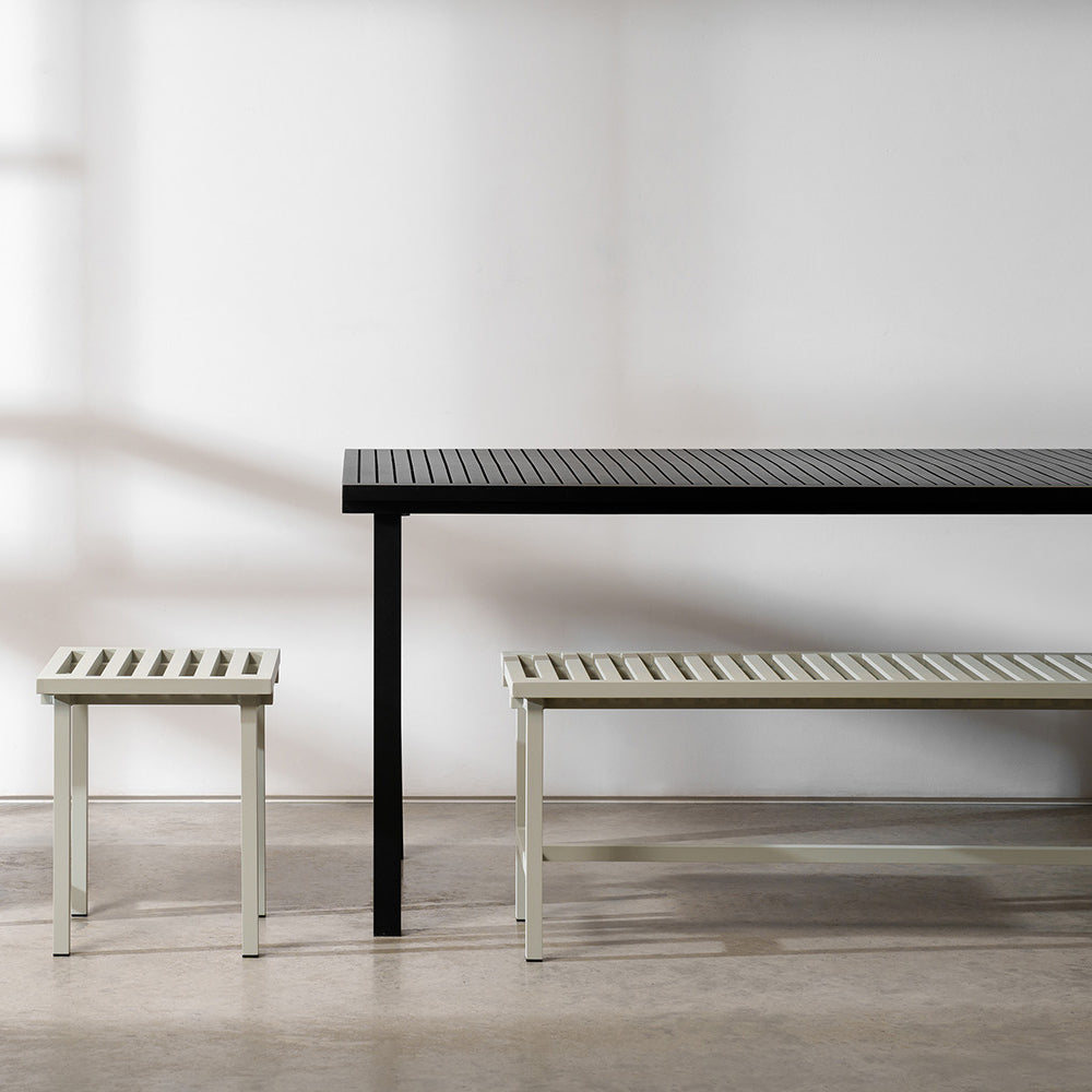 Each piece in the collection has a unique design, but they are unified by the material, colour and the proportions of the aluminium extrusion that defines the collection. You have the option to be playful and select chairs and benches of different designs to place around a table, or choose a matching set.