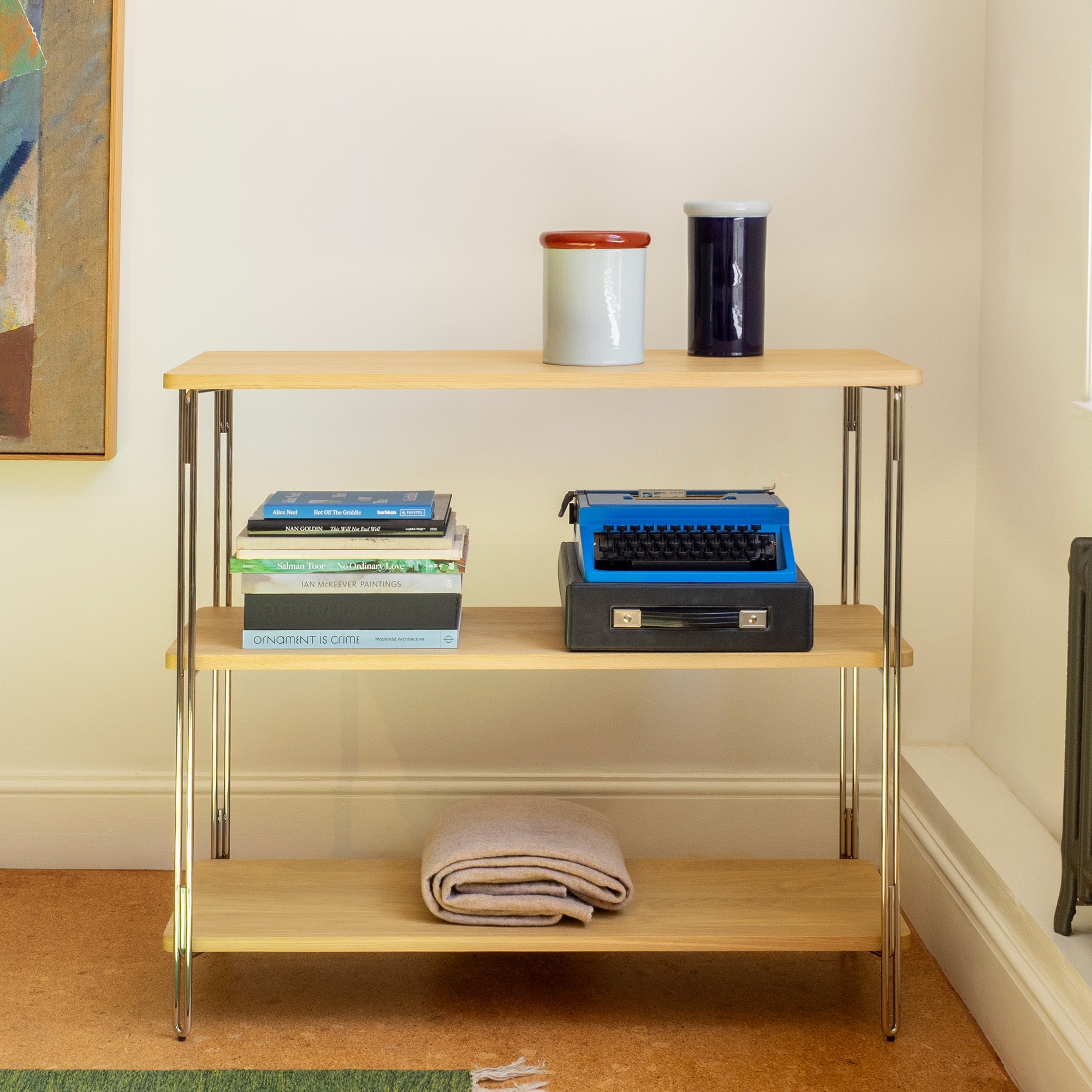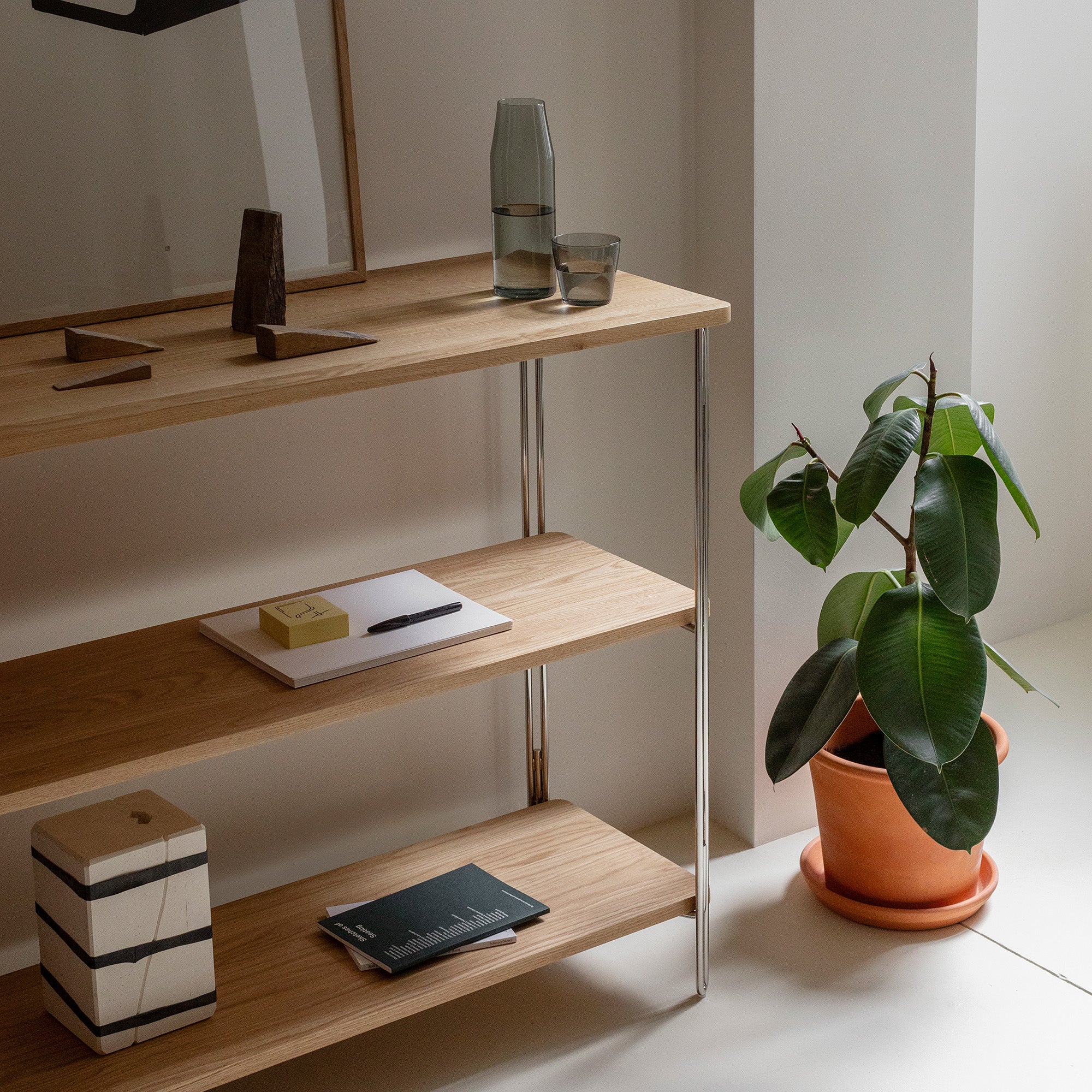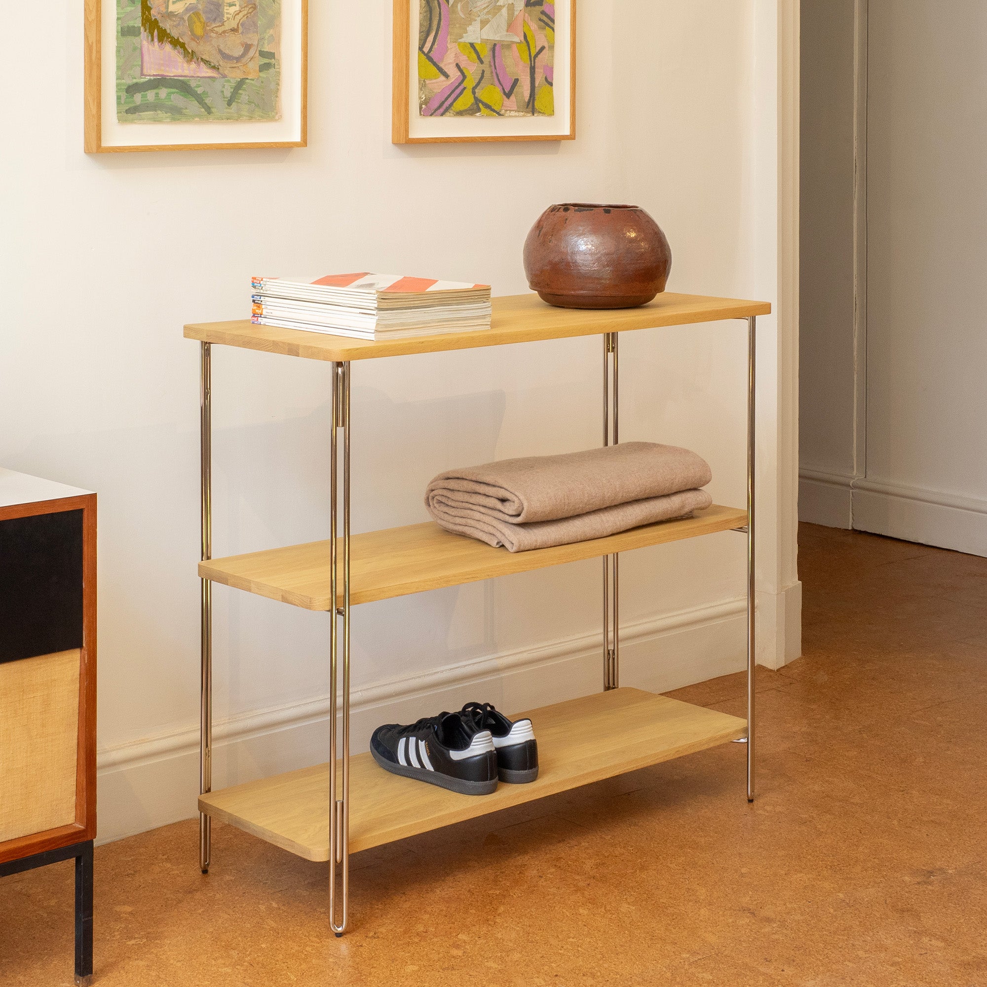 The legs and frames are made from polished stainless steel and the table tops and shelves are made from solid oak. There are 3 sizes of coffee table, 2 sizes of wall-mounted shelving and a floor-standing shelving unit.