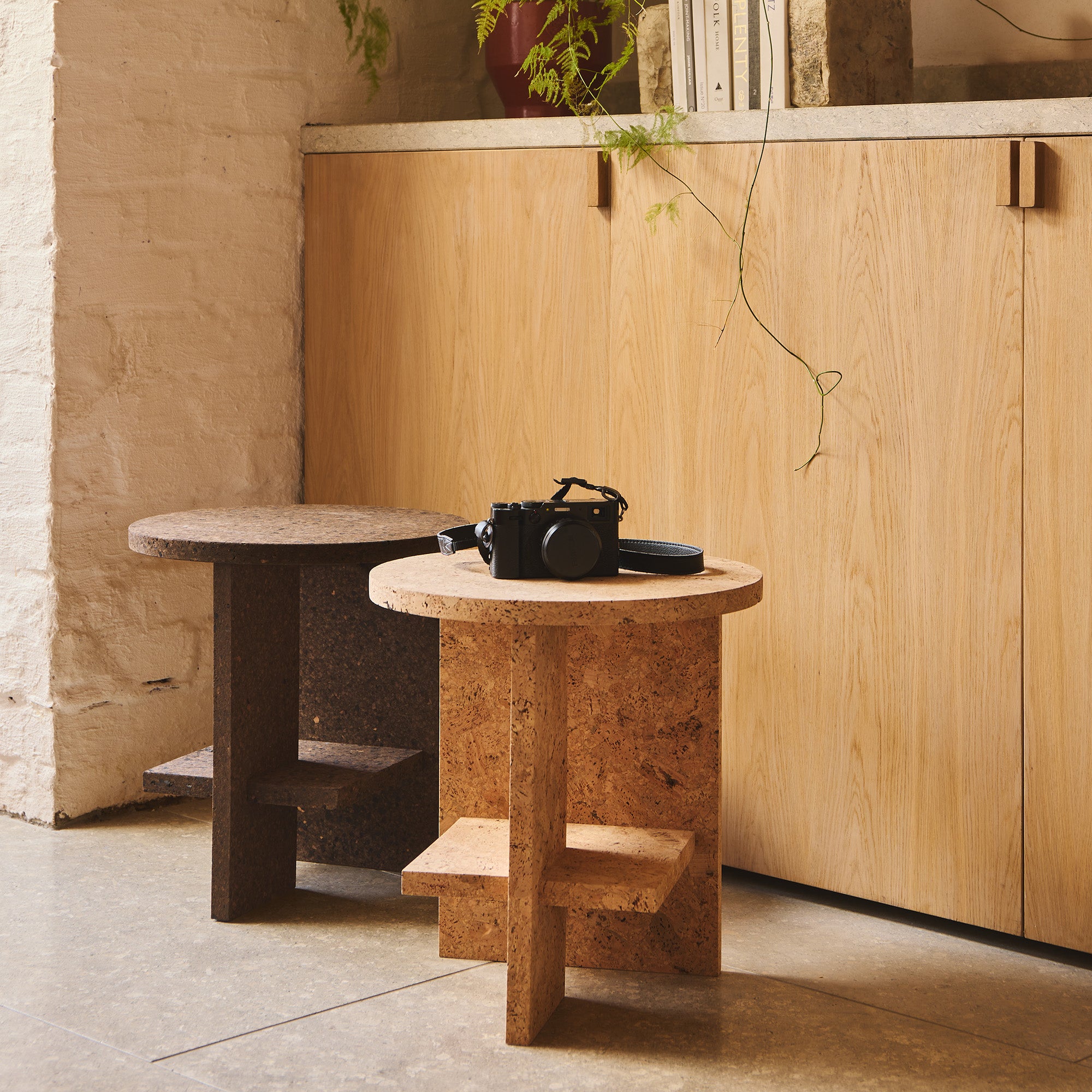 They arrive flat-packed and snap together in seconds, with no tools required. They are made from solid oak and cork in a variety of finishes.