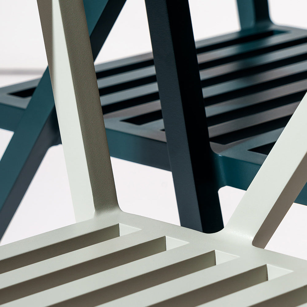 Each piece in the collection has a unique design, but they are unified by the material, colour and the proportions of the aluminium extrusion that defines the collection. You have the option to be playful and select chairs and benches of different designs to place around a table, or choose a matching set.